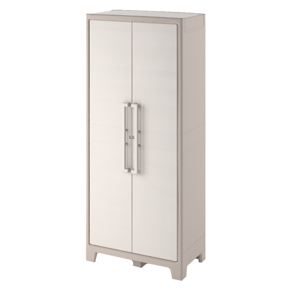 In plastica. Con 4 ripiani rinforzati con barra, portata 30 kg a ripiano, piedini regolabili. Prodotto anti pioggia, è dotato di robuste cerniere in metallo. Soluzione compatta, ideale per ottimizzare gli spazi all'interno e all'esterno della casa. Resistente agli agenti atmosferici IP43.