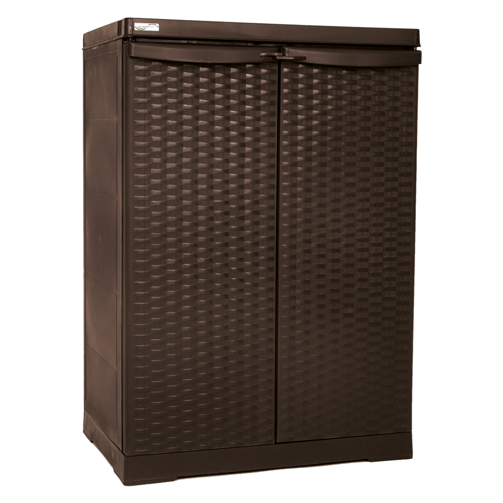 In polipropilene additivato con cariche minerali e materiale riciclabile ed ecosostenibile. Predisposizione lucchetto. 2 ripiani interni regolabili. Peso 9 kg. Colore wenge.