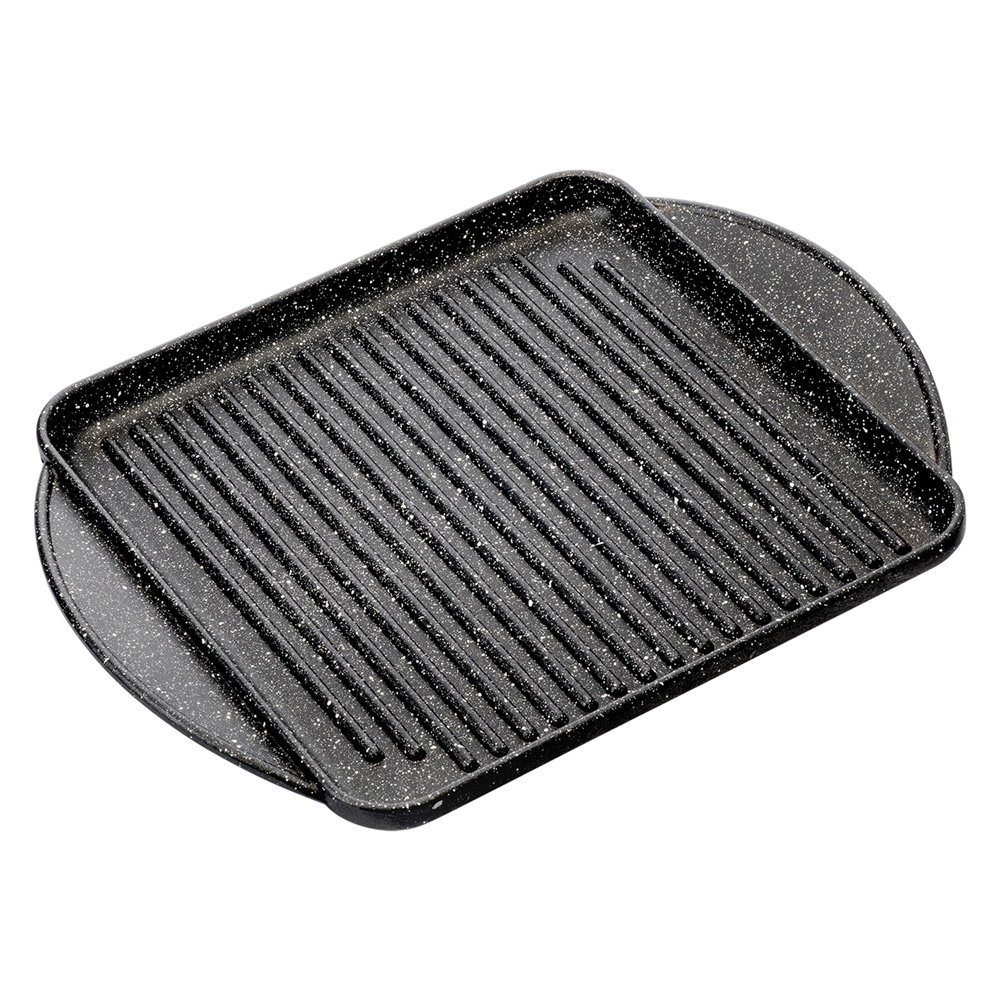 Con superficie rigata e manici integrati laterali. Realizzata in alluminio pressofuso ad elevato spessore, con rivestimento antiaderente di alta qualità . Esente da PFOA, lavabile in lavastoviglie. Prodotto 100% italiano.