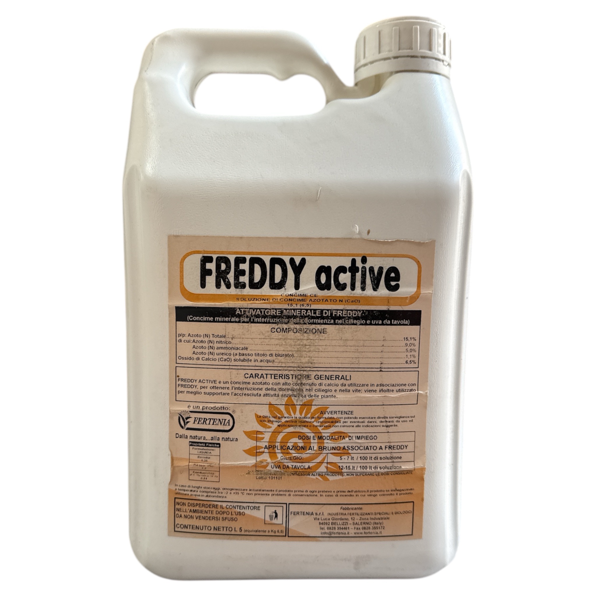 FREDDY è un potente concime minerale della ricerca FERTENIA, con una forte attività stimolante sulla fisiologia vegetale. Specificamente studiato per l’interruzione della dormienza nell’uva da tavola, actinidia e ciliegio grazie a complessi aminoacidici, terpenici e steroidei, sali azotati e di calcio è in grado di agire sui tessuti ed attivare i processi biochimici indispensabili per la ripresa vegetativa fisiologica.
