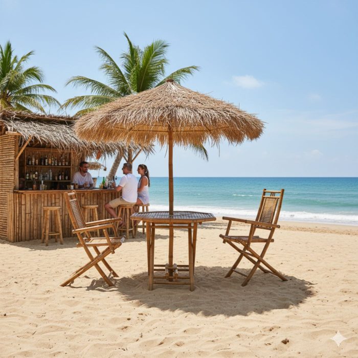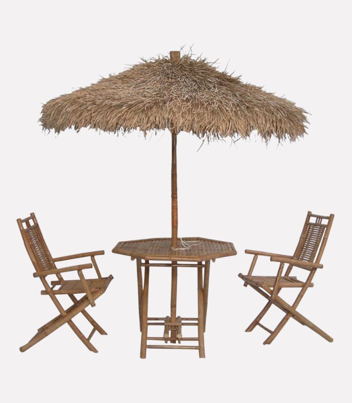 Set outdoor composto da quattro elementi: parasole con copertura effetto paglia, due sedute con braccioli e tavolino richiudibile in bambù naturale dotato di foro centrale per l’inserimento dell’ombrellone. Perfetto per arredare spazi aperitivo, terrazze, stabilimenti balneari e aree verdi domestiche. Indicato per utilizzo all’esterno. Il salottino da esterno viene fornito in kit da assemblare.