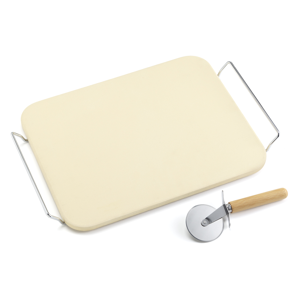 Set completo per la cottura della pizza, include una pietra refrattaria in cordierite (materiale noto per la sua eccellente resistenza al calore e la capacita' di distribuire uniformemente la temperatura, dimensioni 30x38 cm ), un supporto in acciaio inox e una rotella tagliapizza, offrendo tutto il necessario per preparare e servire pizze perfette.