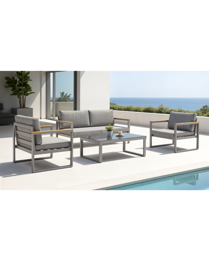 La composizione comprende divano a due posti, due poltrone e tavolino rettangolare, garantendo ampio spazio per il relax all’aria aperta. La struttura in alluminio verniciato a polvere assicura solidità, leggerezza e resistenza agli agenti atmosferici, mantenendo inalterate le prestazioni nel tempo. I braccioli con finitura in poliwood color Teak donano un tocco caldo e naturale, valorizzando il design contemporaneo del salotto. I cuscini, rivestiti in poliestere antigraffio e antimacchia, sono facilmente sfoderabili per una manutenzione pratica e veloce. L’imbottitura interna in schiuma spessa 10 cm offre un sostegno ottimale per schiena e gambe, è resistente alla compressione e recupera rapidamente la forma originale. Il tavolino con piano in vetro temperato da 5 mm garantisce robustezza e sicurezza, risultando perfetto per appoggiare bevande, libri e accessori. Grazie al suo equilibrio tra resistenza strutturale e leggerezza visiva, il salotto Iseo si adatta a molteplici contesti, offrendo infinite possibilità di utilizzo per momenti di convivialità e relax.