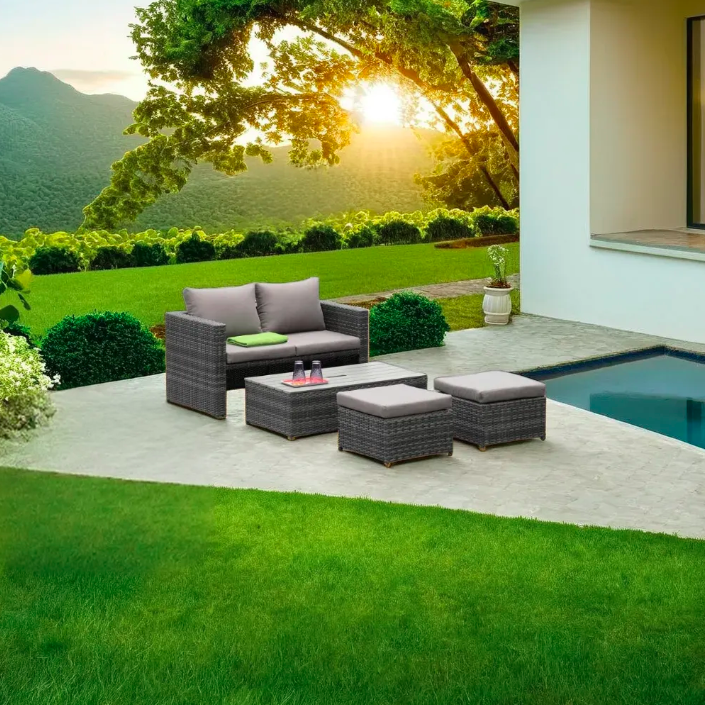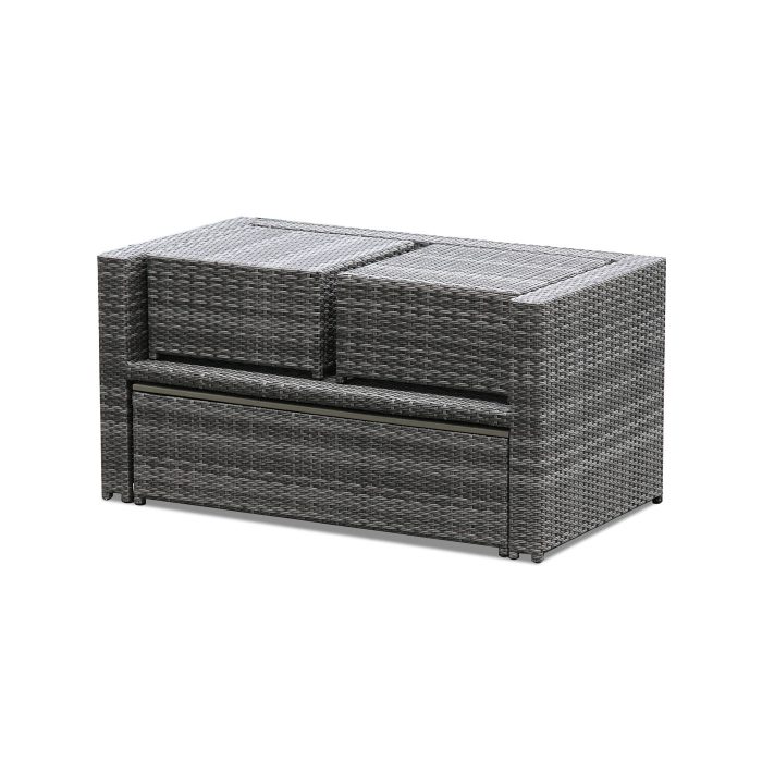 Il set è composto da divano a due posti, due poltrone e tavolino rettangolare, offrendo tutto il necessario per vivere al meglio i momenti all’aperto. La struttura in polirattan intrecciato di alta qualità garantisce resistenza nel tempo: è anticorrosione, resistente all’usura e impermeabile, perfetto per l’utilizzo outdoor. I cuscini in poliestere, piacevoli al tatto, sono progettati per resistere ad acqua e raggi solari e risultano semplici da pulire. Il tavolino con piano in poliwood, pratico e versatile, è dotato di sistema di regolazione automatica che ne aumenta la funzionalità. Tutti gli elementi del salotto possono essere riconfigurati liberamente, consentendo un’ottimizzazione intelligente degli spazi. Anche lo stoccaggio è semplice e compatto, ideale per chi necessita di soluzioni flessibili e salvaspazio.