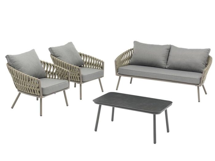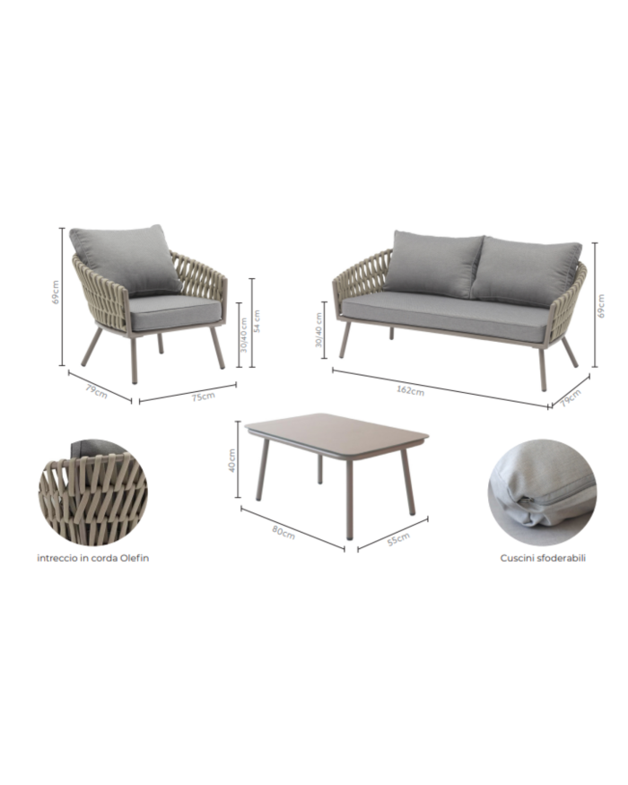 La composizione comprende divano a 2 posti (162x79xH69 cm), due poltrone (75x79xH69 cm) e tavolino con piano in vetroceramica (80x55xH40 cm), tutti realizzati con struttura in alluminio e rivestimento in corda color tortora, una combinazione che dona leggerezza visiva e solidità strutturale. I cuscini inclusi, in 100% poliestere impermeabile e sfoderabile, assicurano comfort elevato e praticità nella manutenzione, rendendo il set perfetto per un utilizzo frequente all’aperto. Le linee pulite e i materiali di qualità rendono il salotto Pula una soluzione distintiva per chi desidera un arredo outdoor elegante e durevole. Per preservare nel tempo l’estetica e le prestazioni dei materiali, si consiglia l’utilizzo di un telo protettivo, utile a prevenire usura e scolorimento causati dagli agenti atmosferici.