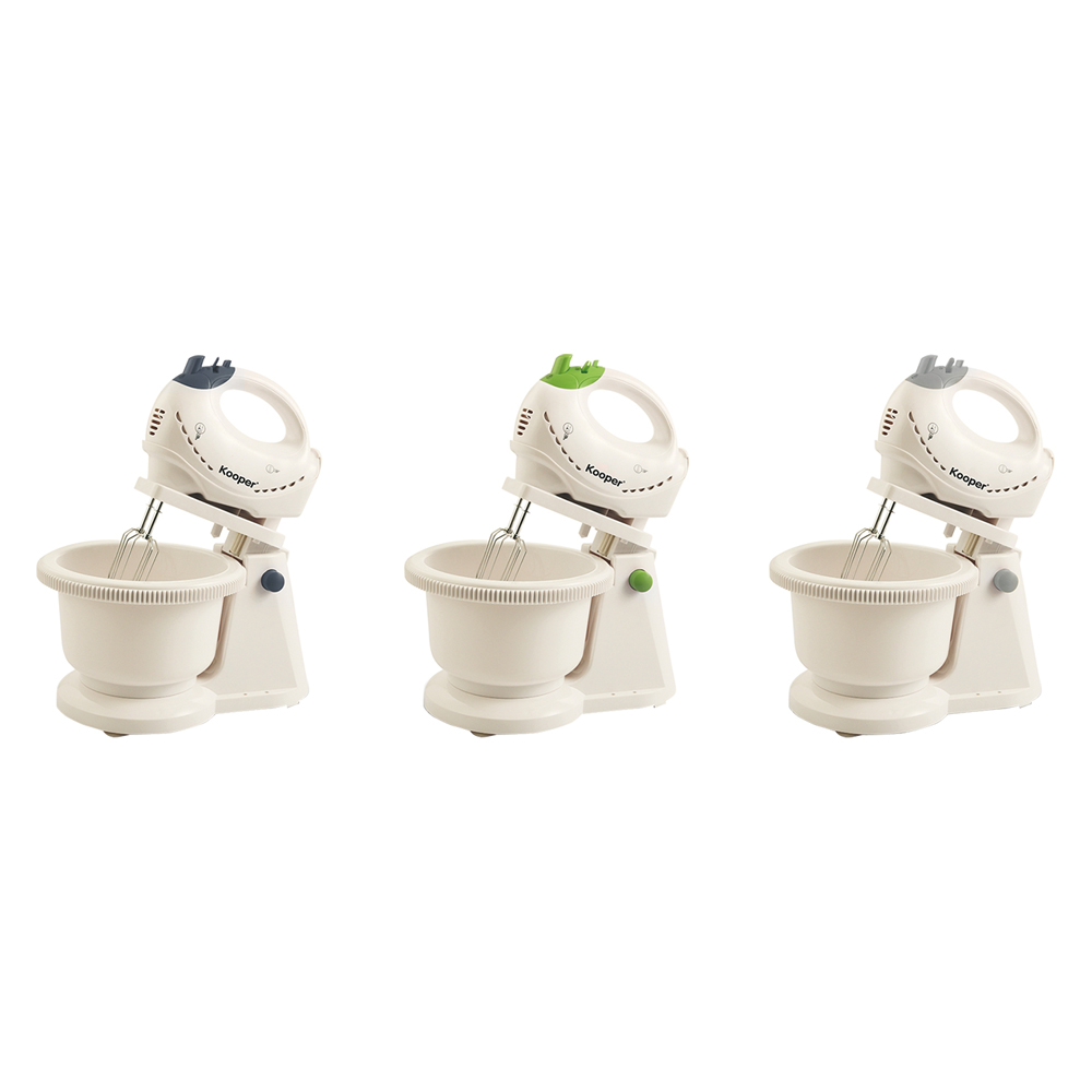 Corpo in plastica. Con ciotola girevole, 5 velocità . Pulsante turbo, completo di 2 ganci in acciaio per impastare, 2 fruste in acciaio per montare, pulsante di espulsione accessori. Piedini a ventosa, base di appoggio, presa ergonomica. Ciotola ø 22,4 x H 11 cm. Capacità 2 litri. Cavo 1,06 metri, 230V-50Hz. Colori assortiti.